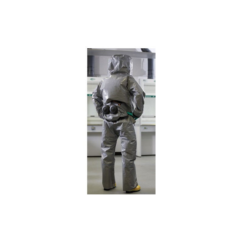 L’appareil PAPR est porté à l’intérieur de la combinaison au niveau de la taille, les filtres étant fixés à l’aide de joints d’étanchéité, ce qui le protège de la contamination.