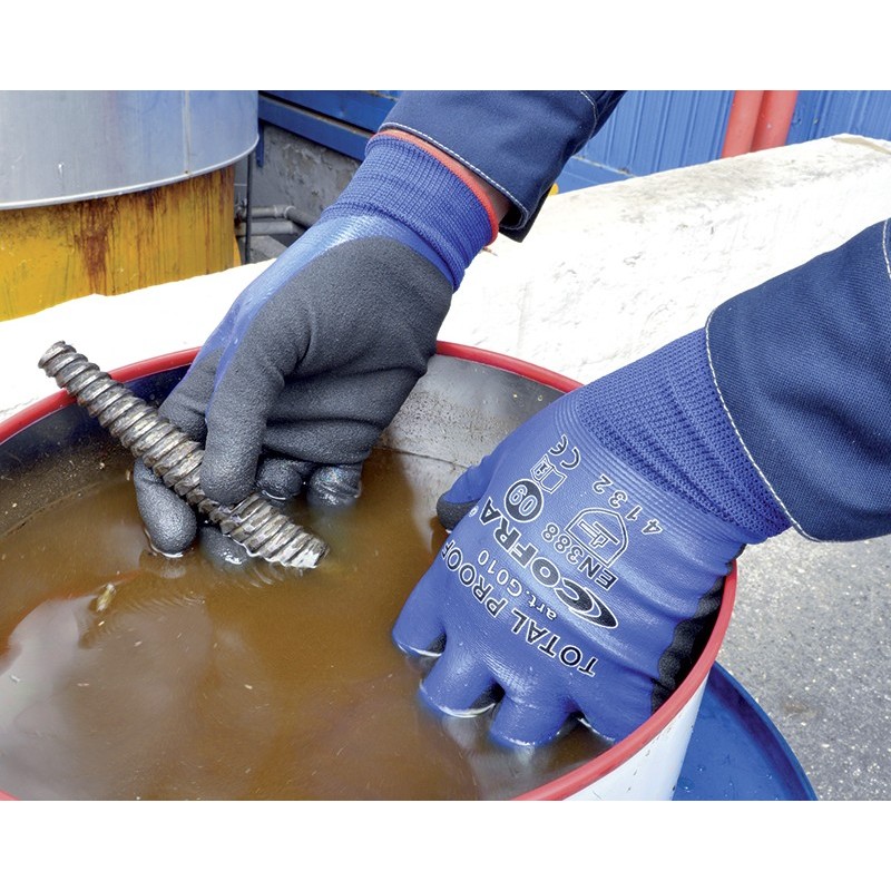PROPRIÉTÉS TECHNIQUES: excellente protection contre les huiles et les graisses, grâce au revêtement total en nitrile, élevée résistance aux l'abrasions, grip élevé sur les surfaces huileuses grâce au spécial revêtement en nitrile sablé, paume en nitrile double couche: robuste et imperméable