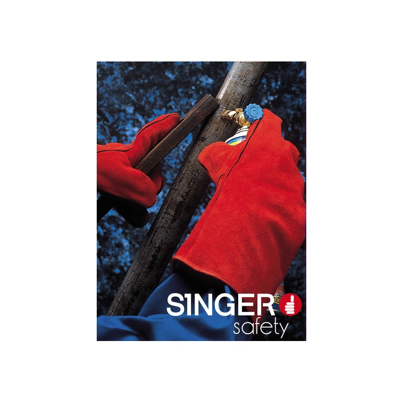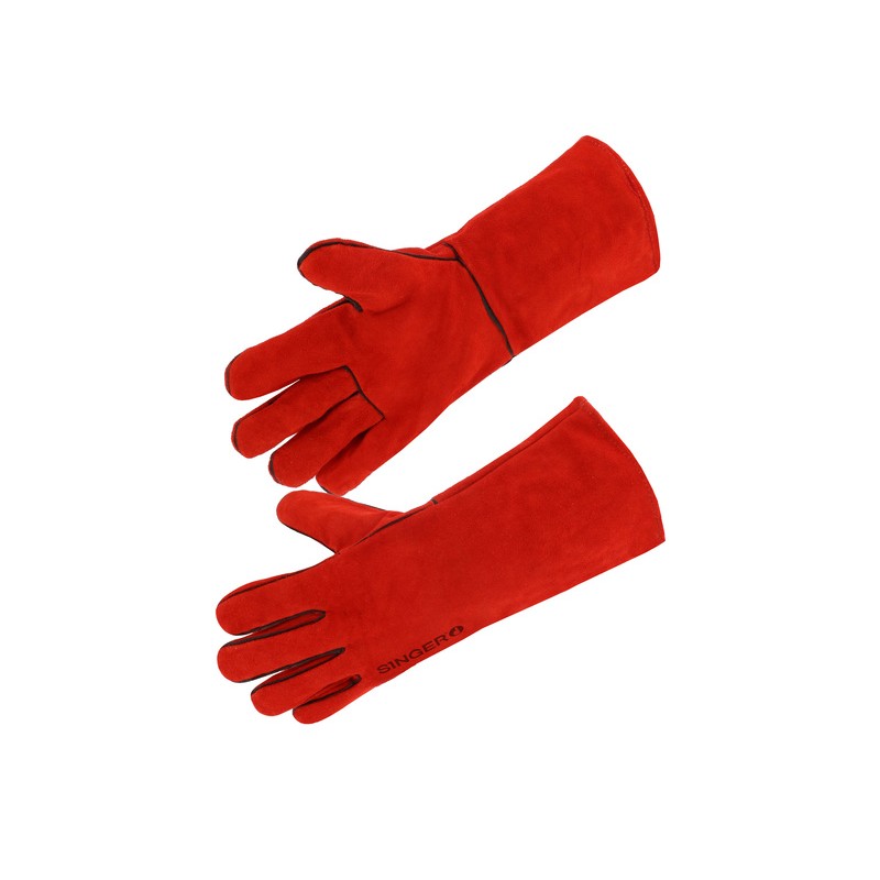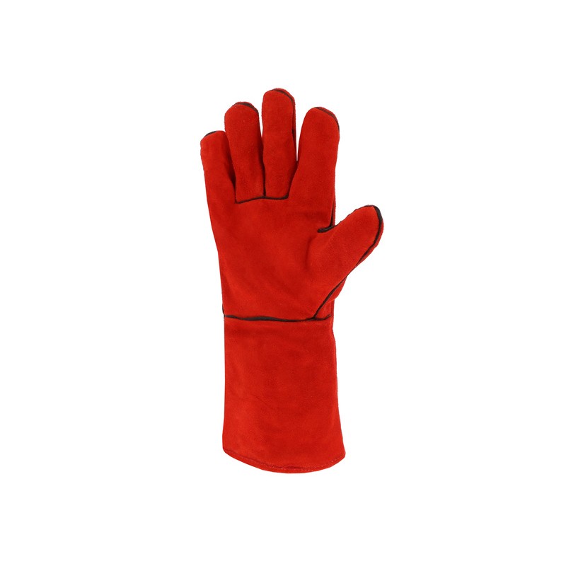 Entièrement en croûte de bovin. Montage américain. Pouce palmé. Dos d'une pièce. Paume et dos entièrement doublée molleton. Manchette entièrement doublée toile coton. Longueur 35 cm. Coutures renforcées par un passepoil. Liseré en bordure de manchette. Coloris rouge.