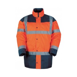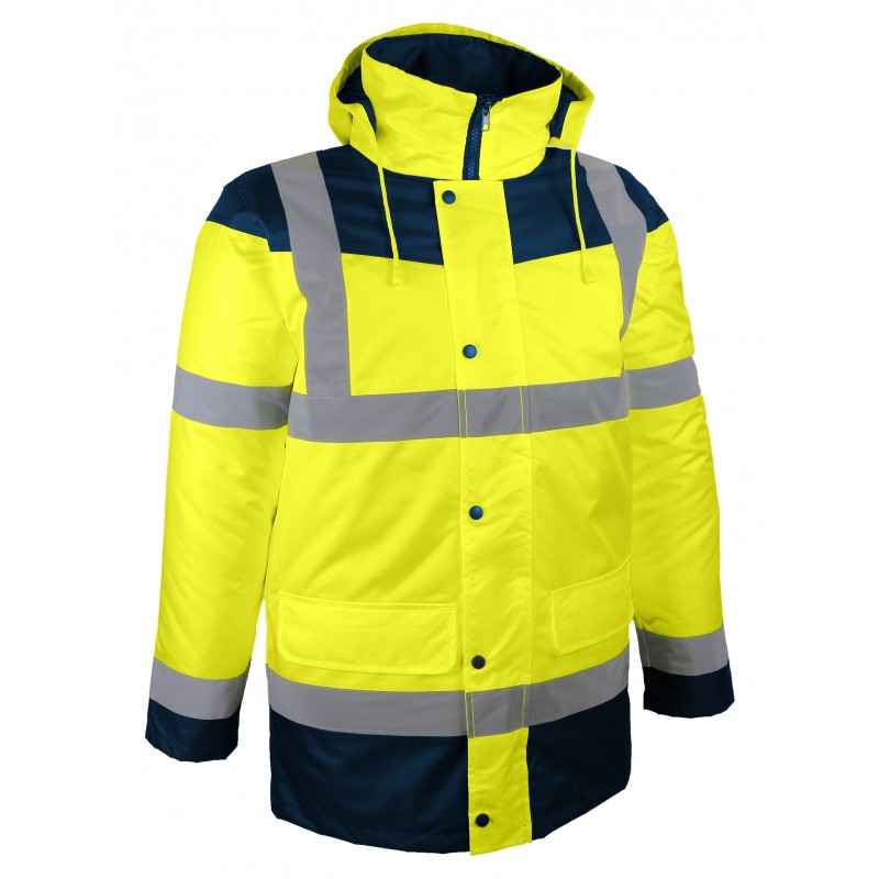 Vêtement de signalisation haute visibilité contre les intempéries avec bandes rétro-réfléchissantes.