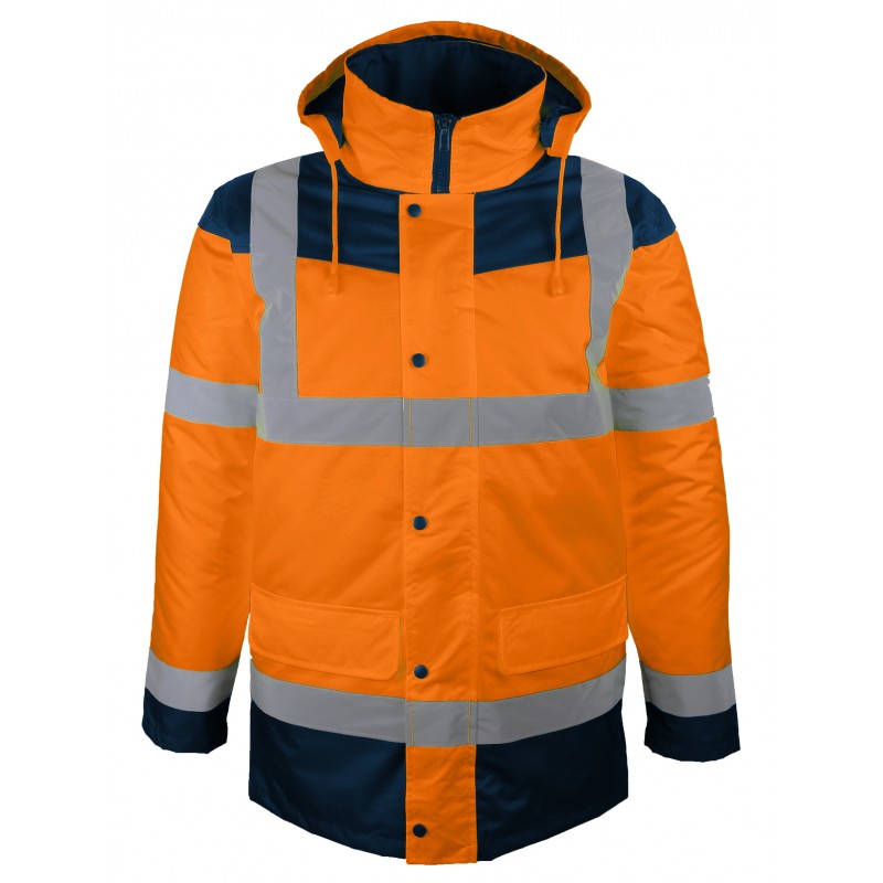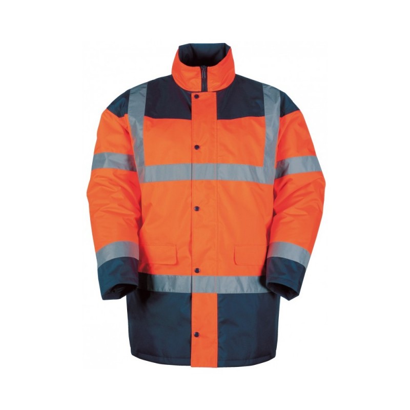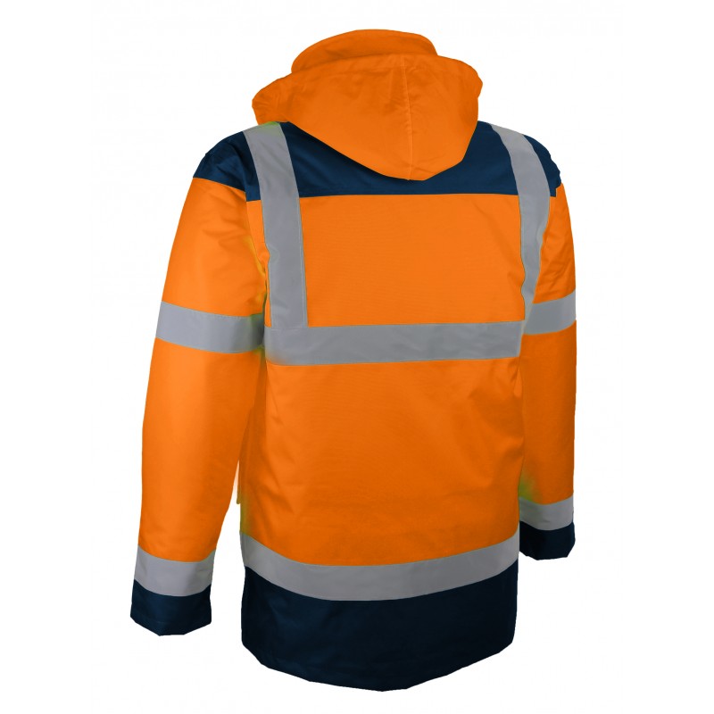 Vêtement de signalisation haute visibilité contre les intempéries avec bandes rétro-réfléchissantes.