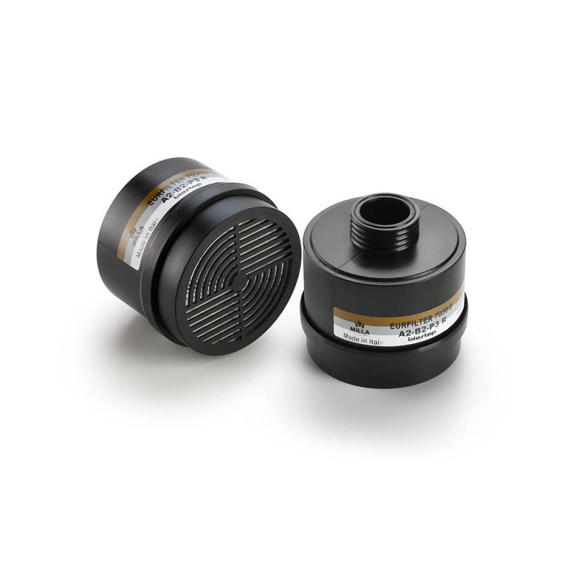 Filtre à gaz avec raccord fileté universel EN 148-1 pour gaz et vapeurs organiques dont le point d'ébullition est supérieur à 65°C, gaz inorganiques, gaz acides, poussières, fumées et brouillards.