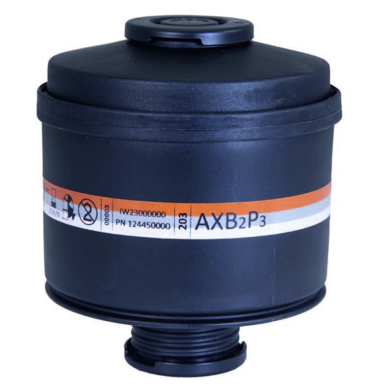 Filtre combiné à pas de vis standard EN 148‑1 pour vapeurs organiques à point d’ébullition <65°C, pour gaz et vapeurs inorganiques et poussières, fumées, brouillards.