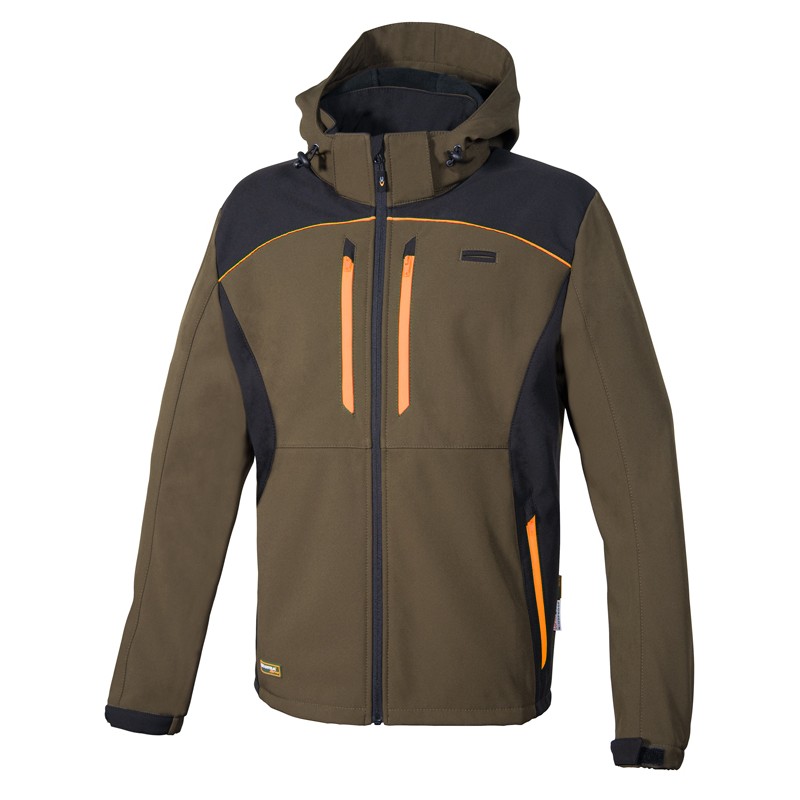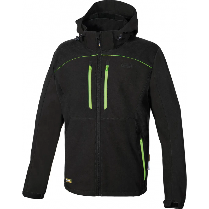 DESCRIPTION: 2 larges poches poitrine fermées avec zip, 2 poches dans le bas avec zip, capuche ajustable et détachable, construction ergonomique des manches, grande poche postérieure imperméable fermée avec zip, ouverture centrale avec zip, poche poitrine porte radio, poignets ajustables avec velcro, rabat de protection au niveau du menton, tissu bi-élastique avec membrane coupe-vent, veste SOFTSHELL avec couche polaire à l'intérieur